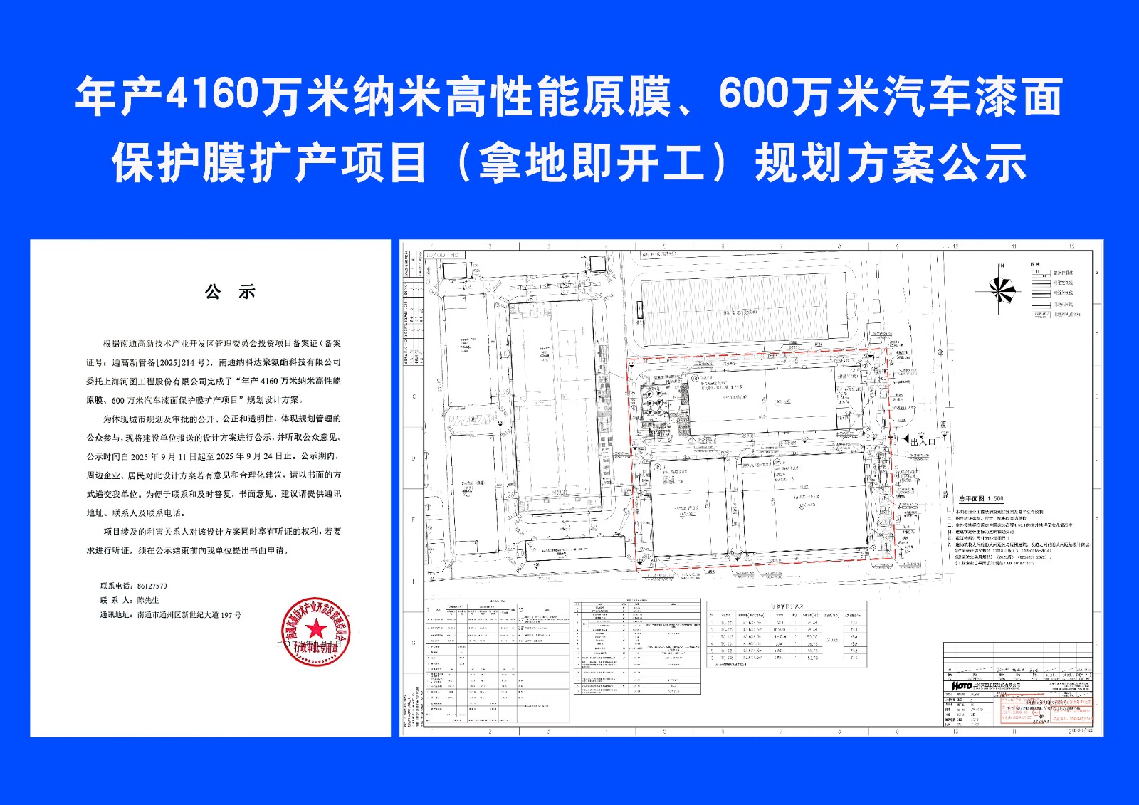 年產(chǎn)4160萬米納米高性能原膜、600萬米汽車漆面保護(hù)膜擴(kuò)產(chǎn)項(xiàng)目(拿地即開工)規(guī)劃方案批前公示